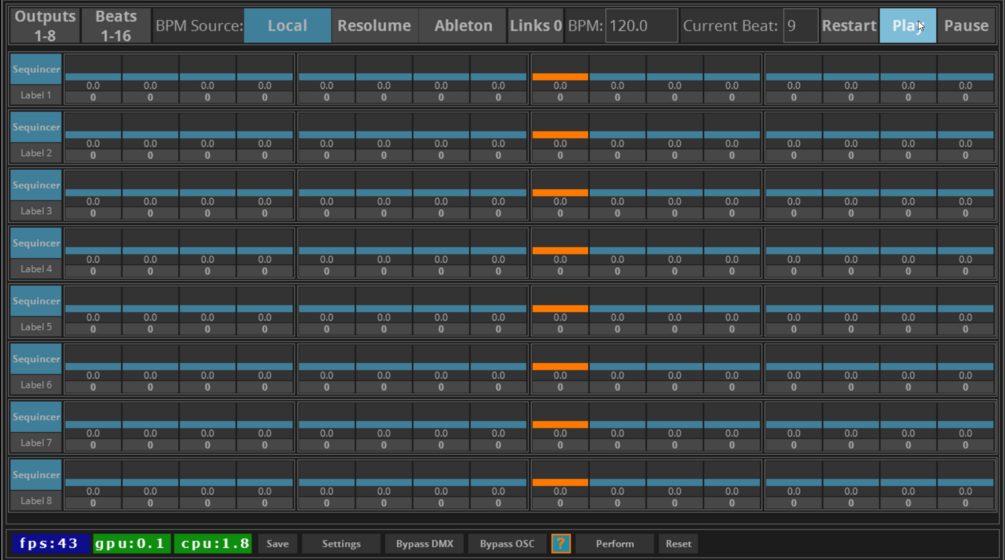 The application Sequincer allows you to build step sequences and output them on OSC and DMX channels. Think of a classic 808 machine but with outputting logic rather than audio.